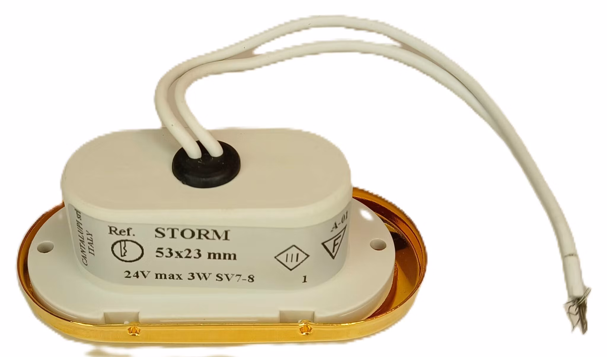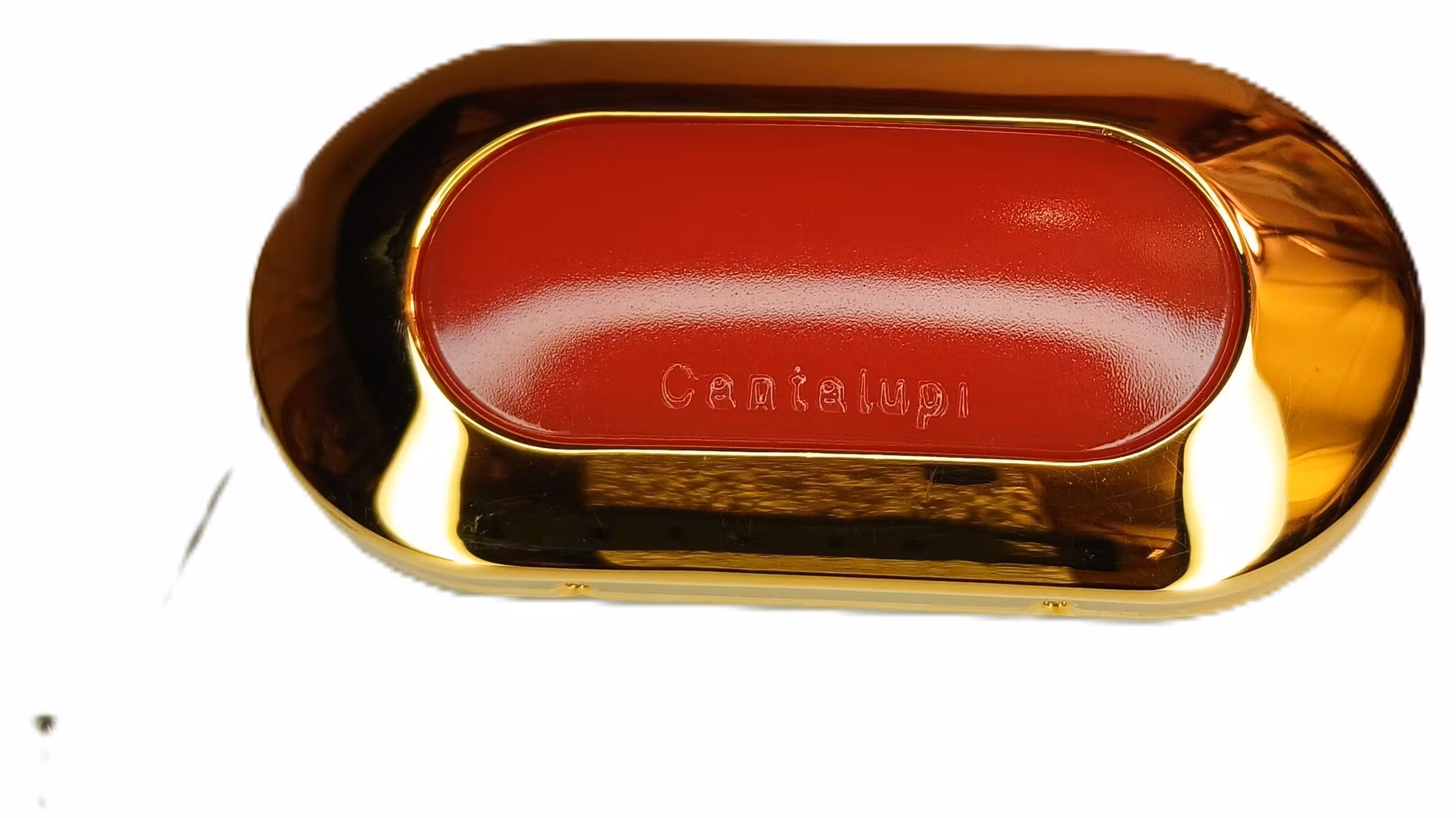 Liten spot, 52x23 mm, med rött glas av märket Cantalupi. 24 V, max 3 W.
