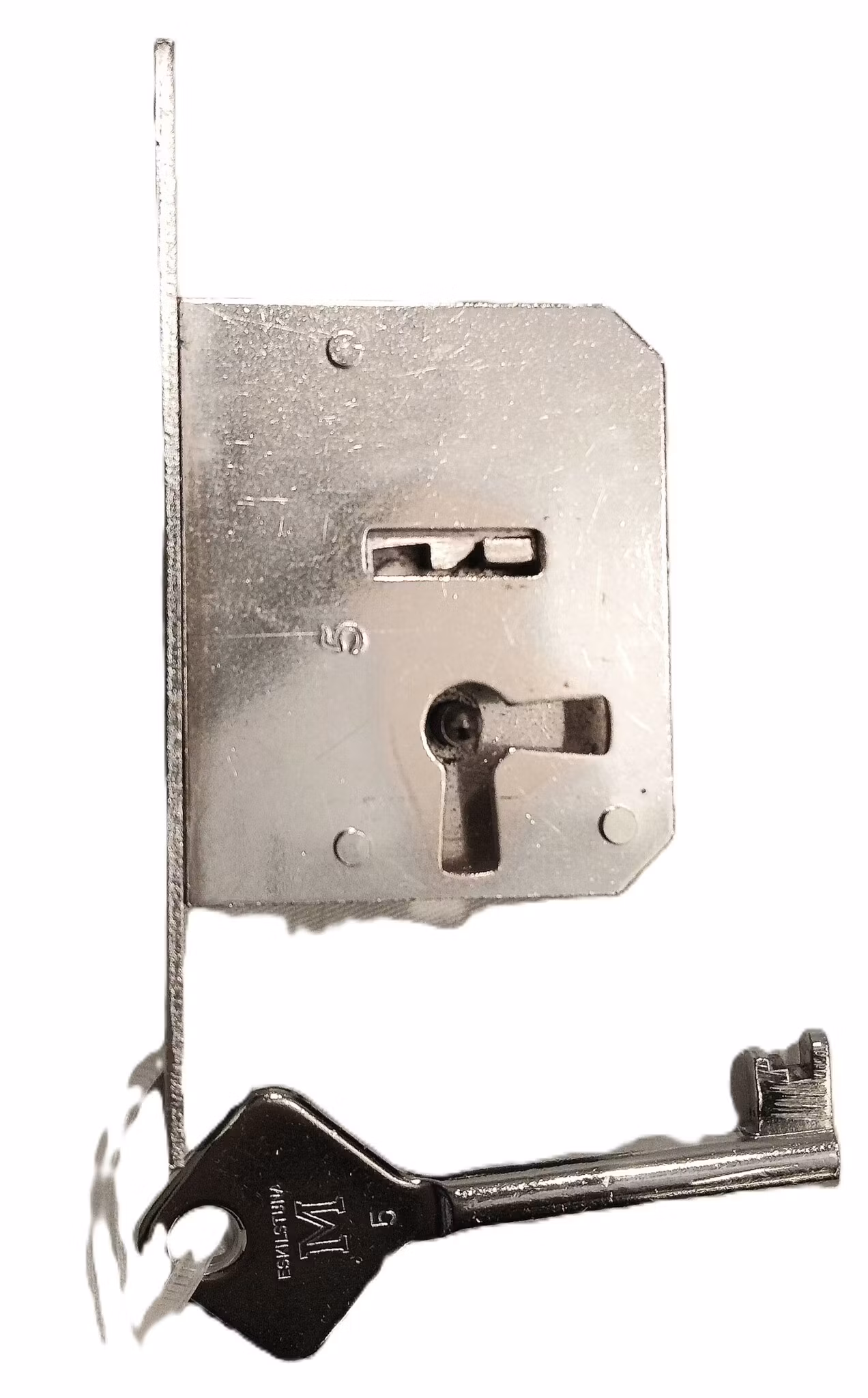 Lås i kromad mässing. Original i Marieholm. En nyckel medföljer. Nummer 5. Kistans mått: 50x36x10