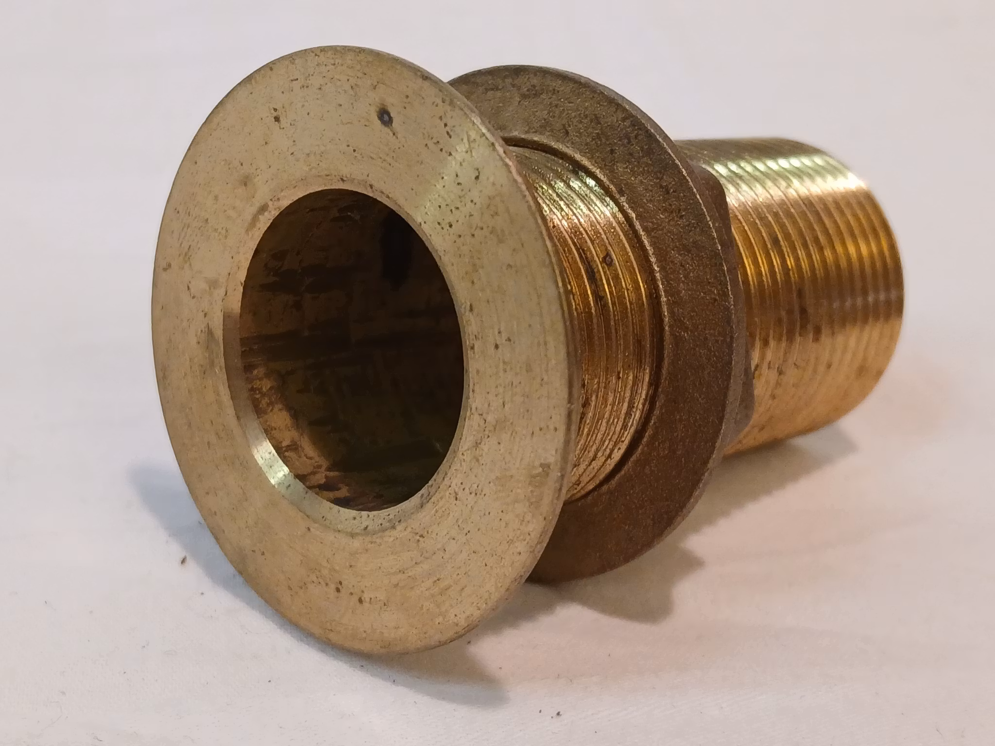 Plan bordsgenomföring i korrosionsfri mässing.Samma egenskaper som brons när det gäller hållbarhet och livslängd i söt, bräckt och saltvatten.