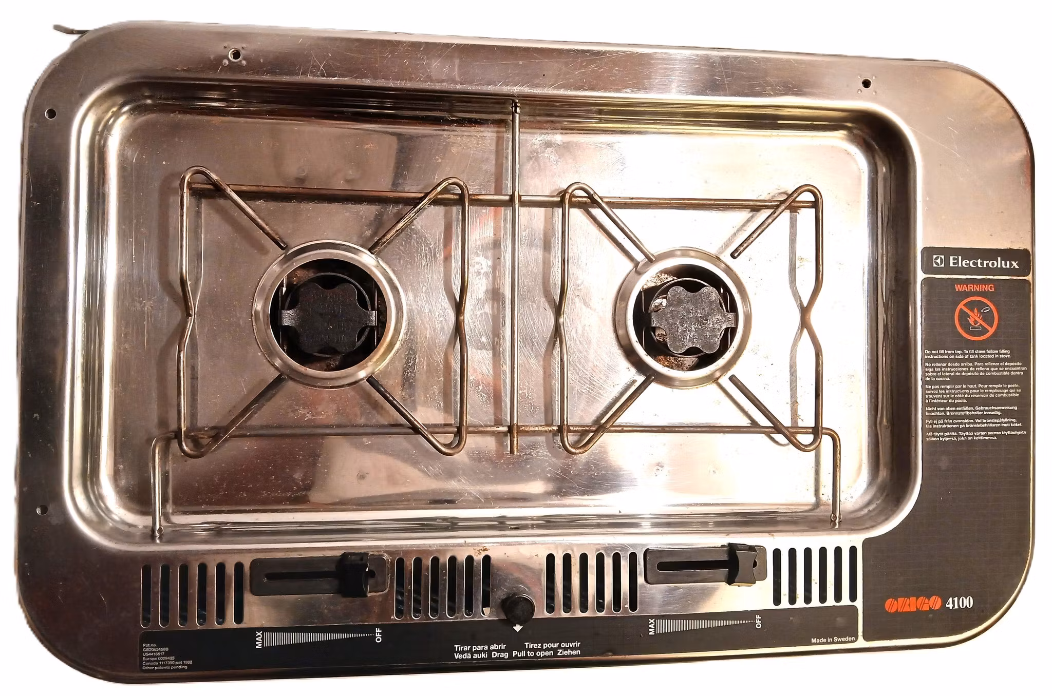 Spritkök med två brännare. Att bygga in, infällning. Köket är tillverkat i rostfritt stål och fungerar enligt absorptionsprincipen. Ilagd skärbräda medföljer.